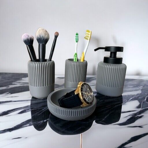 Badezimmerset Raya 4-teilig aus Polyresin in Taupe, 250ml Seifenspender, moderne